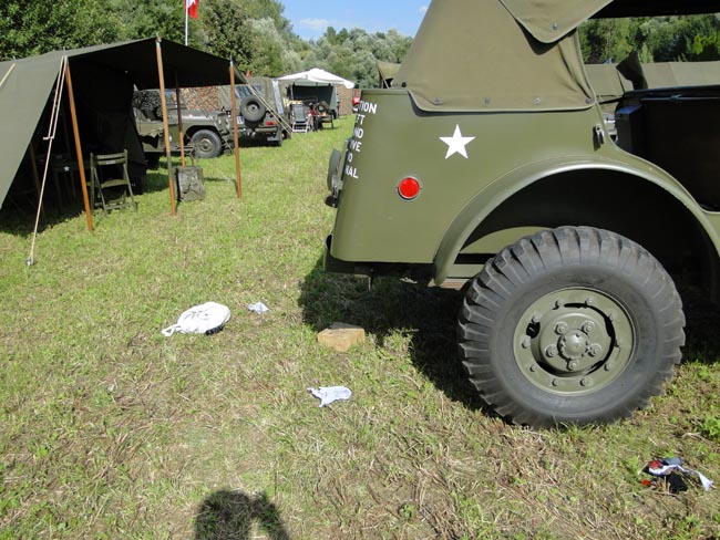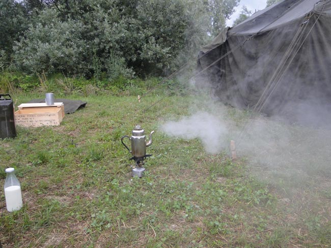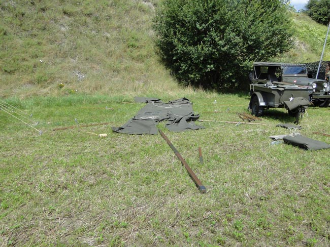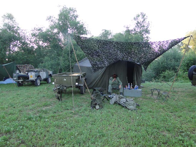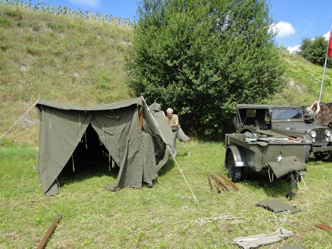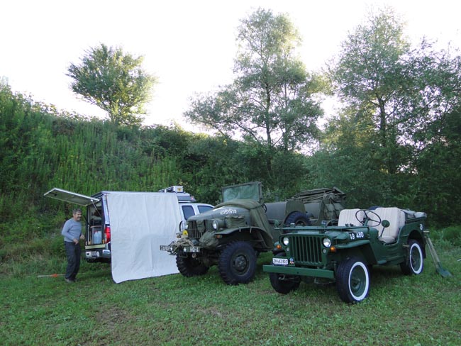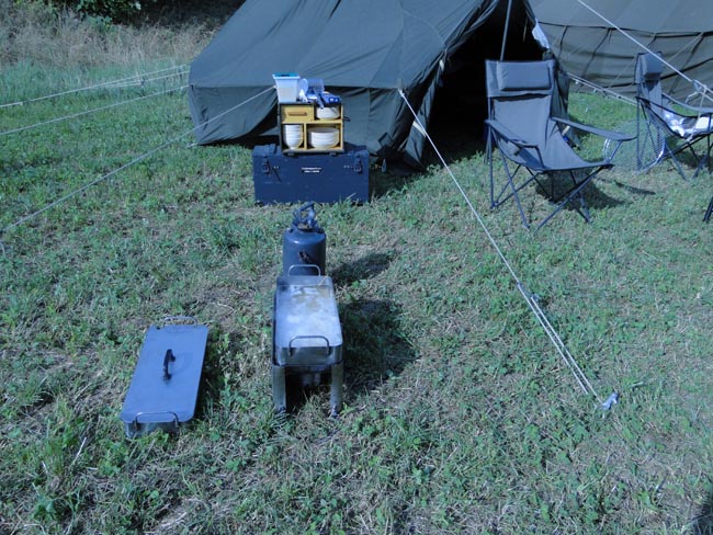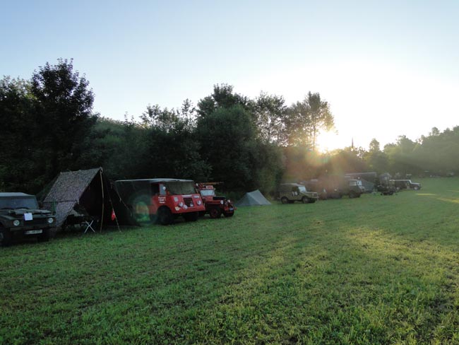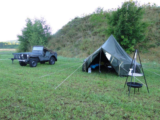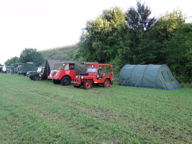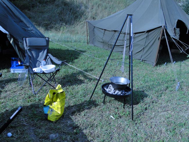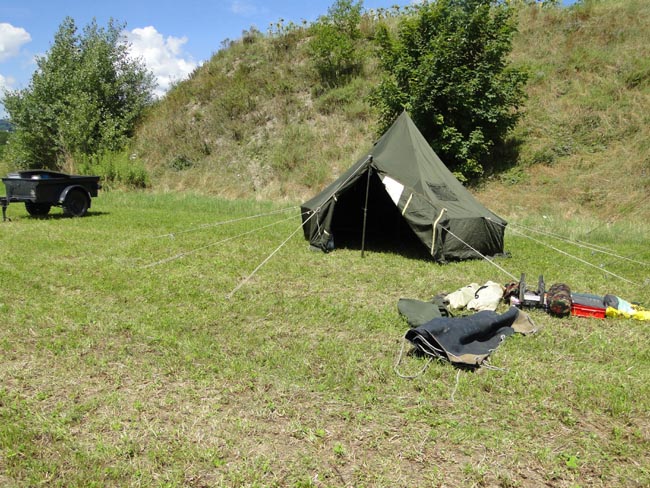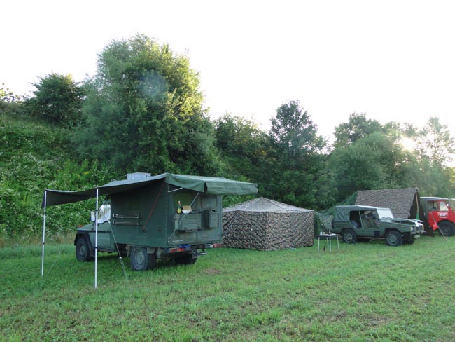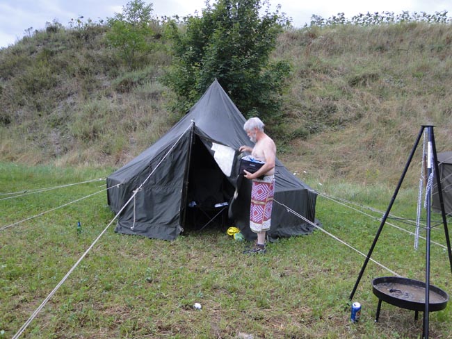 | Anhand der Wetterlage, habe ich mich entschlossen, früh mein Zelt abzubrechen und mich auf den Heimweg zu machen, habe ich doch cirka zwei Stunden zu fahren. | Beim Verabschieden, meiner alten und hoffentlich neuen Freunde, fing es an zu Regen. Also Ölzeug anziehen, ob es nun Militärisch ist oder nicht, Hauptsache ich bleibe Trocken. |
