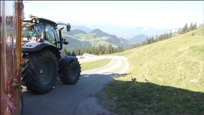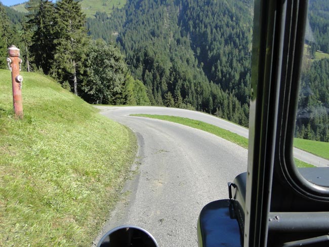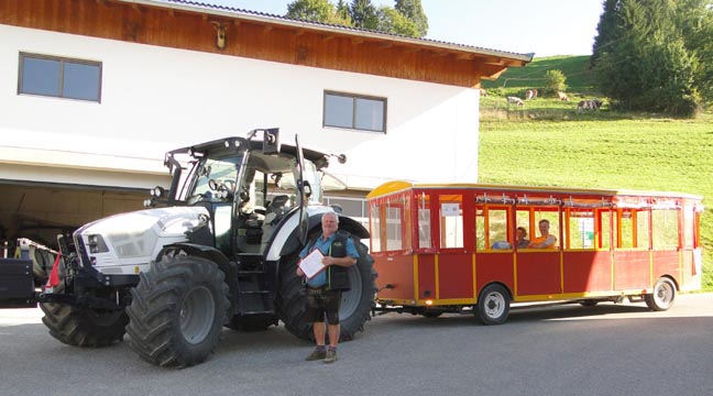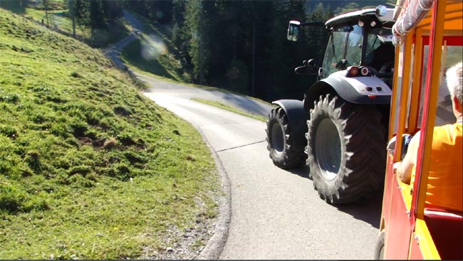 | Am nächsten Morgen wurden mit einem Spezielen Fahrzeug zum Frühstück gefahren. | Strasse zur Tanzbodenalm. Vom Gasthof zum Frühstück