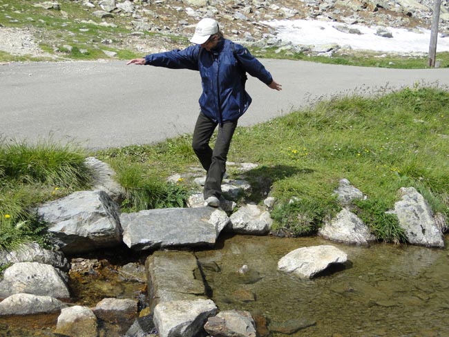 | Meine liebe Ehefrau beim Balanceakt über einen reissenden Strom. | 200 Meter vor unserem Haus hatten wir diesen Kilometer Stand. |