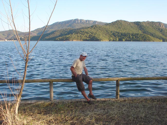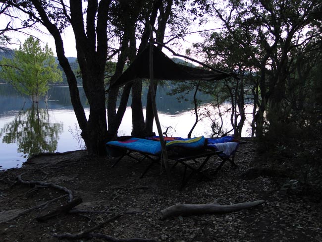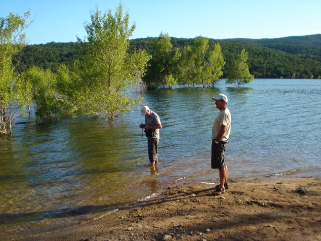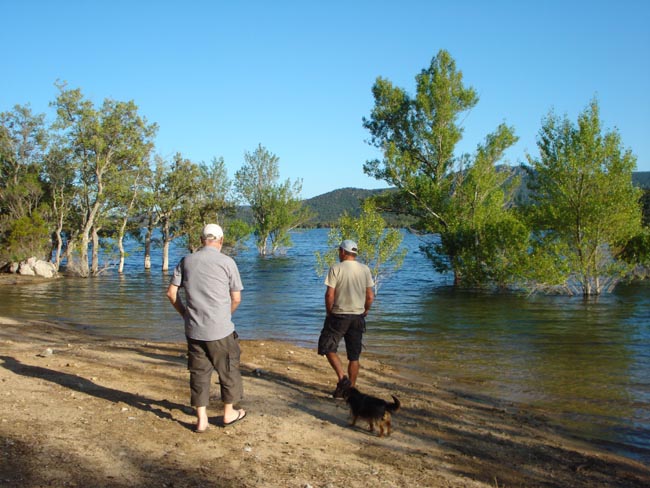 | Glücklich am Stausee angekommen. | Wo Übernachten wir? Ich weis einen guten Platz. |