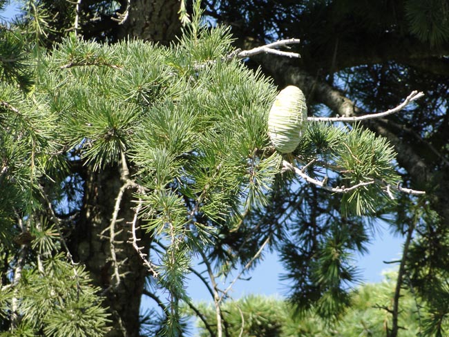 | Dieser Zeder hat sicher viel zu erzählen. | Ein Zederzapfen weit oben, einer der wenigen an diesem Baum. |