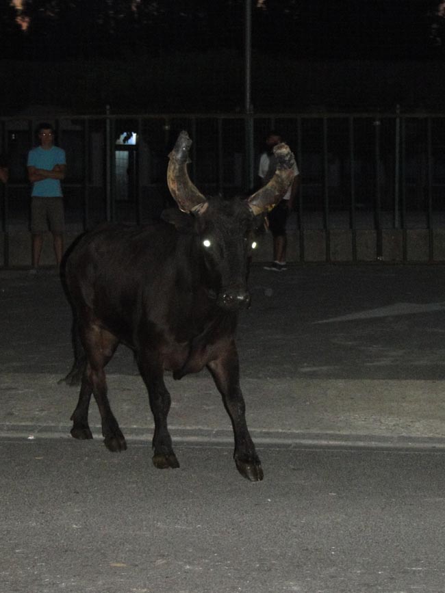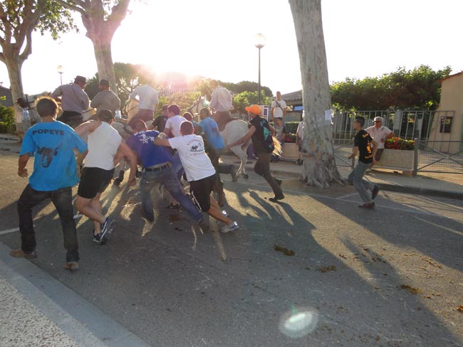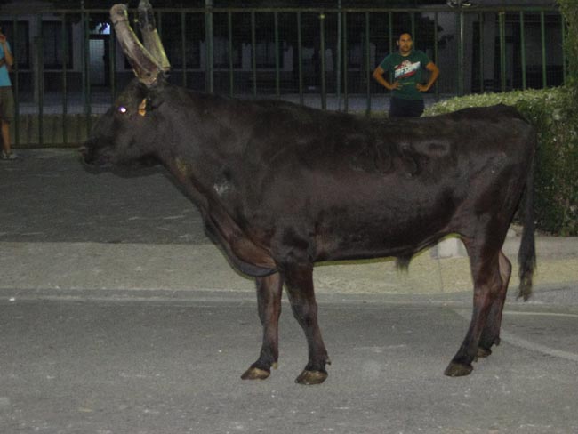| Die jungen Leute versuchen den Stier auf den Rücken zu legen. | Warten auf den nächsten Einsatz. Manchmal waren es bis zu fünf Tiere. |
